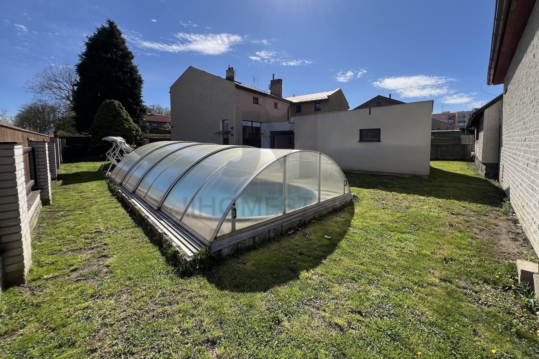 Na udržované zahradě s novým plotem se nachází zastřešený bazén.