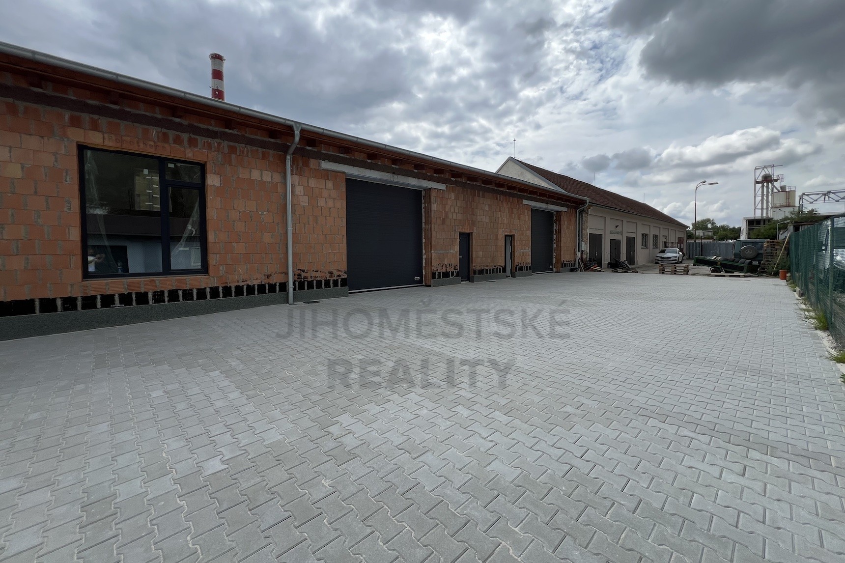 Garáž/sklad má novou výmalbu, 25 cm betonová podlaha, elektrická sekční vrata, elektřina 230V i 400V.